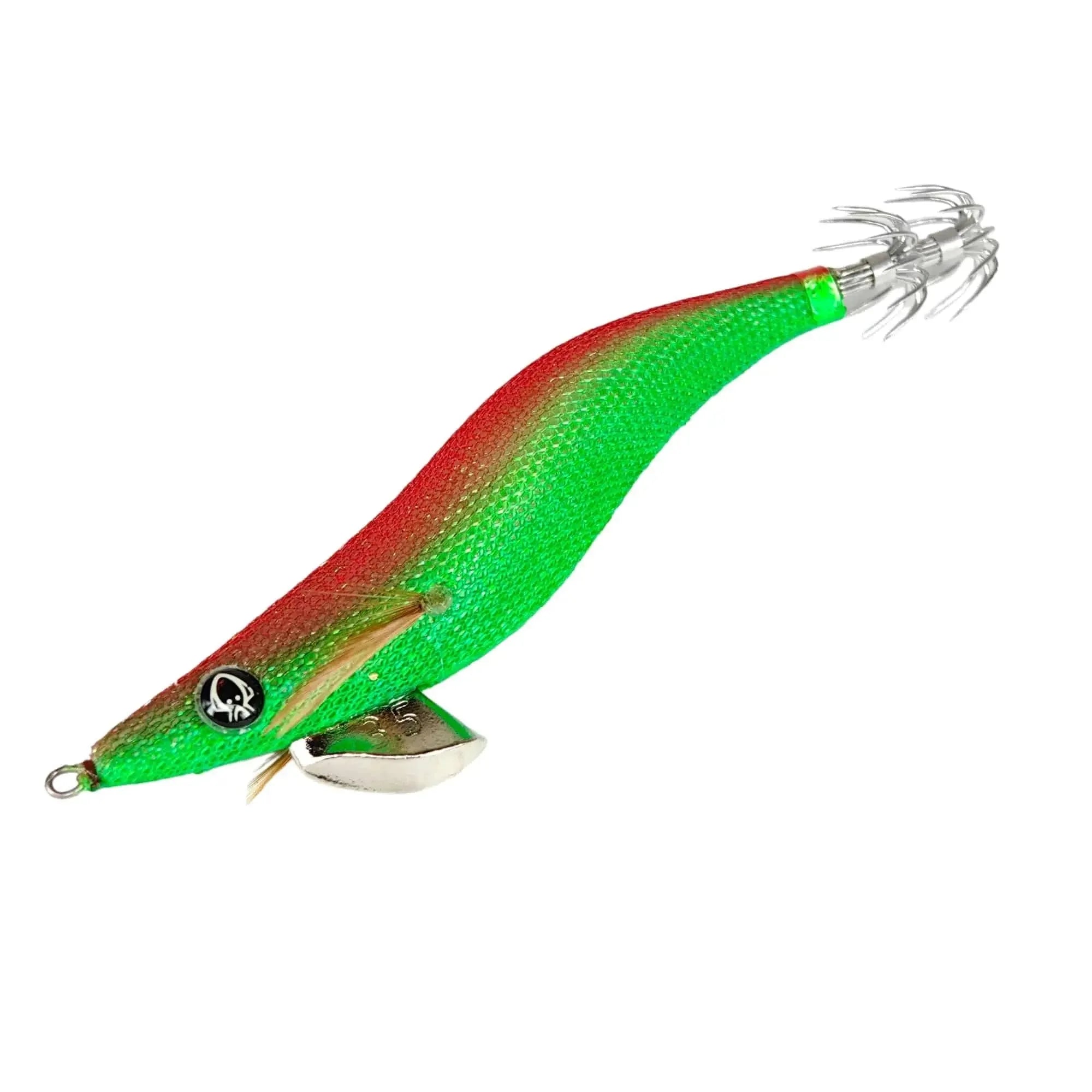The extreme green-red contrast is specifically designed to provoke reactive, aggressive strikes — highly effective when squid are feeding aggressively.